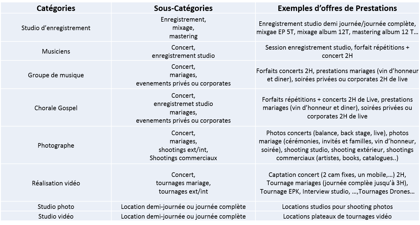 NB : Chaque type (catégorie) de prestation est constitué de sous-catégories de prestations.